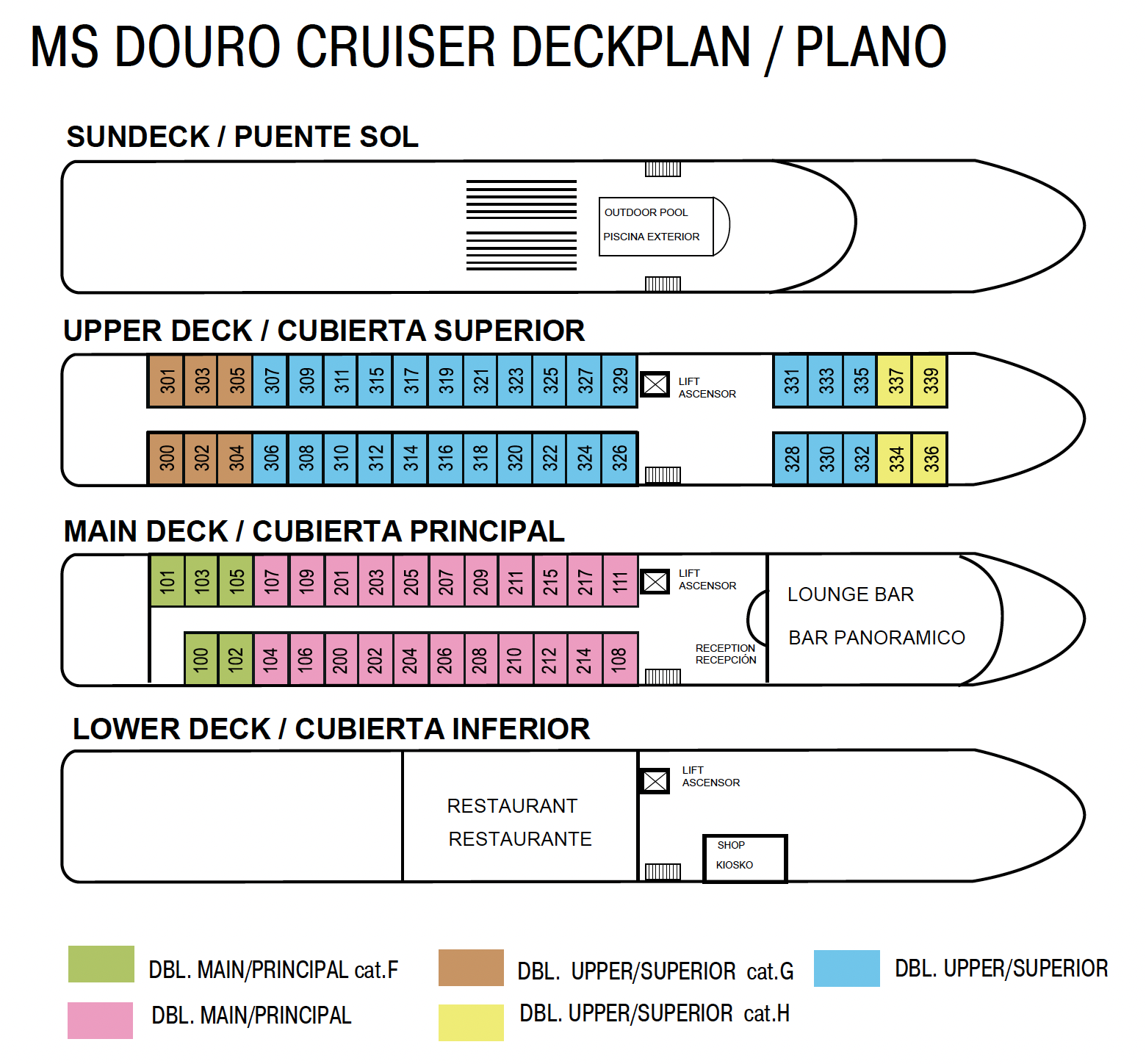 All cabins are outer cabins. Those on the upper deck have an accessible balcony. All main deck cabins have large panorama windows that cannot be opened. All cabins have an approximate size of 15 m² (including balcony area with upper deck cabins).